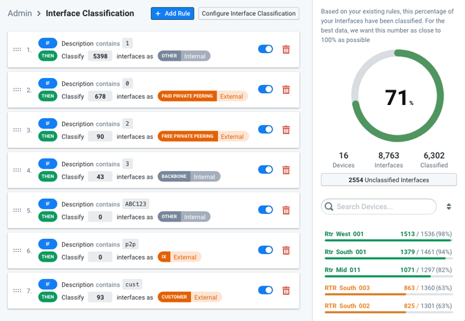 Interface classification is an automated process whereby the value of the network boundary and connectivity type attributes are specified for the interfaces of every device that your organization has registered with Kentik. The classification process, which is run from the Interface Classification Page of the Kentik portal, involves creating and applying any number of “if-match-then-classify” rules. The rules engine periodically evaluates interface description and IP addresses gathered via SNMP polling for the interfaces of your devices. It looks for a match with conditions defined in your rules, and if a match is found it classifies the matching interface as specified in the matched rule.