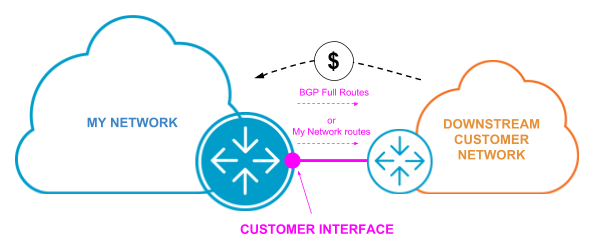 An interface (or bundle of interfaces) classified as “Customer” would most typically point towards a downstream customer. The BGP session established through this interface would normally announce to that downstream customer either a full route view (in a case that is often referred to as “Full view transit”) or a partial route view (often referred to as “Partial Transit”). A customer interface can be seen as the financial inverse of a transit (full view) or paid private peering (partial view) interface.