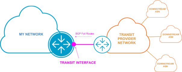 An interface whose connectivity type is classified as “Transit” is used to connect to an upstream provider of Internet connectivity. These interfaces typically support BGP full routes.