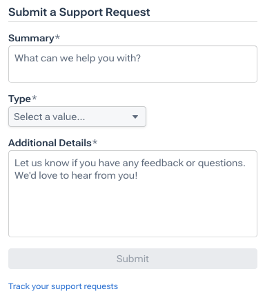 - To view your support requests, click on the Track your support requests link located below the Submit button. This will redirect you to the Support Portal, where you can manage your requests.