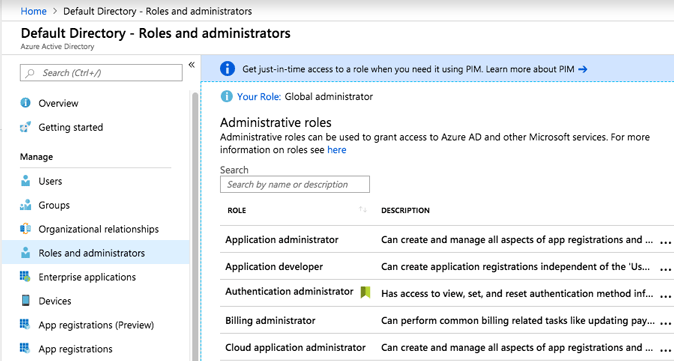 - In the resulting Default Directory - Overview page, find the Manage list (second sidebar from the left) and click Roles and administrators.