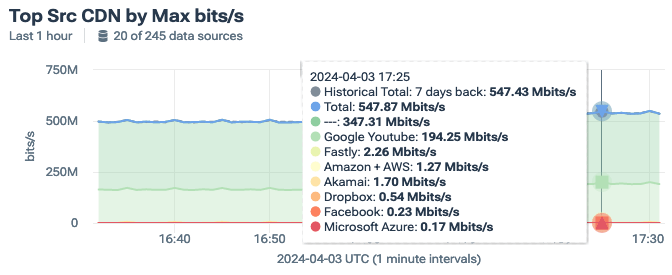 src_cdn: The commercial name of the CDN derived from the source IP (inet_src_addr) of an ingested flow.- dst_cdn: The commercial name of the CDN derived from the destination IP (inet_dst_addr) of an ingested flow.