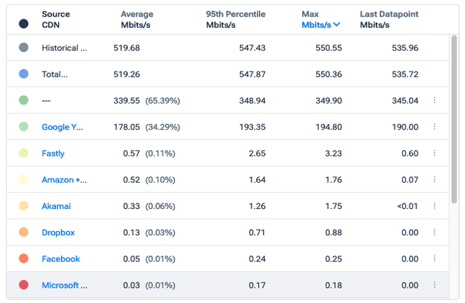 Using CDN for filters or group-by dimensions in Data Explorer or Dashboard queries can reveal (among other things) how much of your traffic is coming from (shown in screenshot below) or going to various CDNs.