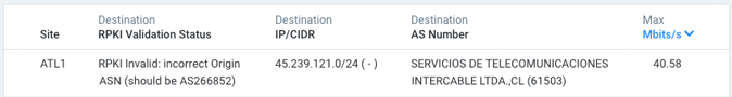 Example: The ROA specifies a prefix of 141.193.36.0/22 and a maxLength of 24. A flow whose prefix is 141.193.26.0/25 would be out of bounds. - RPKI Invalid: incorrect Origin ASN (should be AS<AS_Number>): The origin ASN specified in the route doesn’t match the ASN specified by the ROA, indicating an apparent route hijack. No secondary announcement has been found, so if strict route validation is enabled then traffic corresponding to this prefix will be dropped.