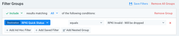 - In the Filtering pane, set an ad hoc filter (see Ad Hoc Filter Controls) in which RPKI Quick Status equals "RPKI Invalid - Will be dropped". Query results will show only traffic that would be dropped by strict validation.