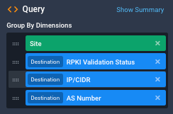 Using these two dimensions, you can filter (e.g. in Data Explorer) on RPKI Quick Status to return a table of the top-X flows marked with either of the "invalid" values, then check the RPKI Validation Status column of the table to see the specific issue.