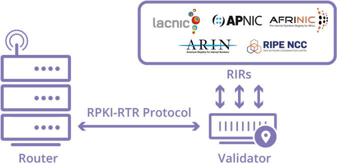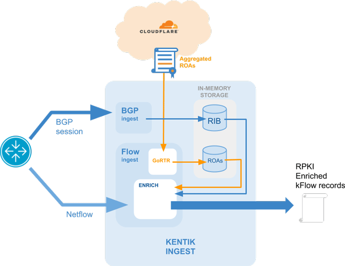 Kentik currently supports RPKI via Cloudflare's GoRTR, which uses a centralized RPKI validator that consolidates the five RIR ROA databases. A list of valid routes from this central validator is securely distributed via Cloudflare's own CDN using a lightweight local RTR server. At ingest we consult our local cache of the GoRTR data, determine the RPKI validation state associated with the router sending a flow, and use that state to derive the RPKI values that we assign to RPKI columns in the KDE flow record.