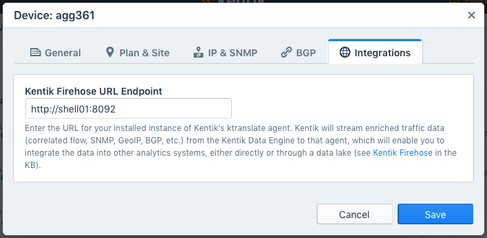 Note: ktranslate does not currently input HTTPS. Use a proxy to convert to HTTP before passing encrypted kflow to ktranslate (HTTPS » [proxy] » HTTP » [ktranslate]). - Each Kentik-registered data source (e.g. router or host) can send data to one or more endpoints (URLs), which each represent a single instance of ktranslate. To specify ktranslate endpoints for a given data source, use the Integrations tab of the Device dialog (see Firehose Data Sources), which is accessed in the portal via the Devices page (Settings » Devices).