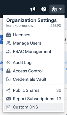 Note: In the menu, the number displayed to the right of Report Subscriptions is the number of subscriptions your organization is currently using. - Custom DNS: This link brings you to the Custom DNS Page, where you can run a Verify Reverse DNS Lookup. See About Custom DNS.