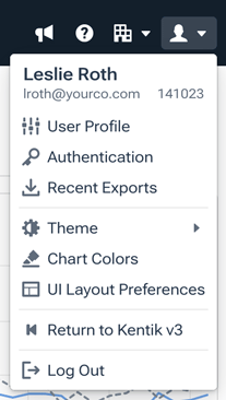 User Profile: Your Kentik User Profile page is where you can set your portal preferences for layout, display, notifications, landing page, time zone, and theme. You can also reset your password and manage two-factor authentication and API tokens.- Authentication: Takes you directly to the Authentication Settings of your User Profile where you can reset your password or manage your API token and two-factor authentication settings.
