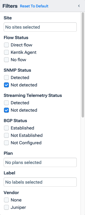 Reset to default (present only when one or more filters are specified): A button that removes all currently set filters.- Collapse: A button that collapses the Filters pane. To expand the pane, click the Show/Hide Filters button (see Devices Page).