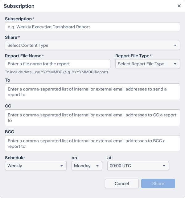 - Share dialog: On any portal page with a Share button in the SubNav (see Portal Page Layout), click the button to open the Share dialog, then fill in the Subscription tab (see Sharing by Subscription). The portal modules in which you can set up a subscription are listed in Sharable Views.