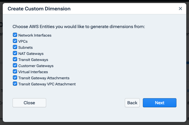 - Select the AWS or Azure Entity keys from which you'd like to create a custom dimension, then click Next.