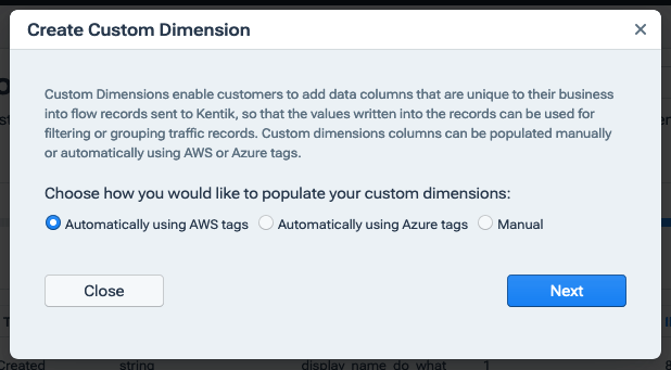 Note: If your organization has already reached its limit of custom dimensions (see Dimension and Populator Limits), the Add Custom Dimension button will be grayed-out, and you will not be able to add any custom dimensions without first deleting existing dimensions. - Select Automatically using AWS tags or Automatically using Azure tags, then click Next.