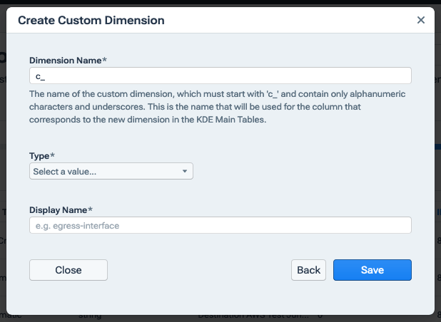 Adding or editing a custom dimension via the Kentik portal involves specifying information in the fields of the custom dimension admin dialogs. The dialog used for these settings depends on what you're trying to do: