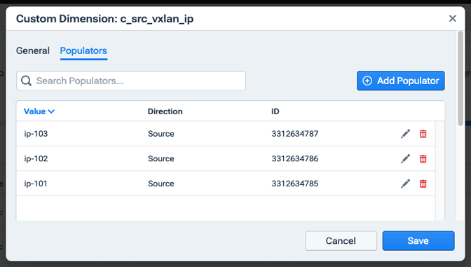 - Up to 10,000 populators can be assigned to a custom dimension, but only one populator’s value can be stored per flow record. If multiple populator’s match, the most recently added populator’s value is used.