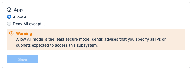 Note: If you choose to switch to Deny All except, be sure to enter in the IP Addresses/Subnets field the IP address from which you are connected or else your access will be denied when you click Save. Users who try to log in from an IP/subnet that is not allowed will see an "Unable to authenticate" notification on the Kentik login page. - Agent: Default is Allow All. Switch to Deny All except is recommended.