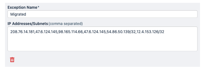 Note: Access Control is based on the public IP from which you attempt to connect to a given Kentik subsystem, even if your client is on an RFC1918 private LAN or behind NAT. - Remove: A button (trash icon) that opens a confirmation dialog from which you can remove the exception group (see Remove an Exception Group).