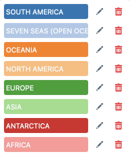 Custom Geo Map: A world map that is color-coded to indicate which countries belong to your organization's various custom geos.- Custom Geo list (at right): A list of your organization’s currently defined custom geos. Each row in the list includes the name of a custom geo against a background whose color corresponds to the color used for the custom geo on the map. A row also includes the following UI elements: