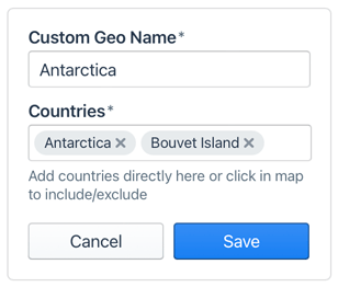 - Custom geos are mutually exclusive, so a given country can only be included in one custom geo at a time.