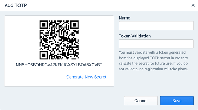 - Add TOTP: A button that opens the Add TOTP dialog so you can register a new TOTP authenticator.
