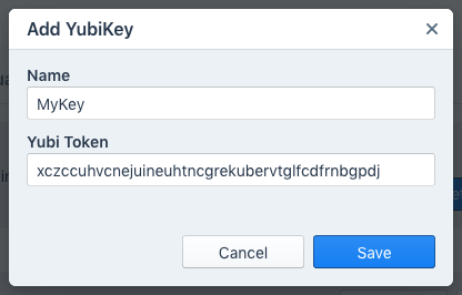 Click the Add YubiKey button to open the Add YubiKey dialog.- Enter an appropriate name into the Name field.