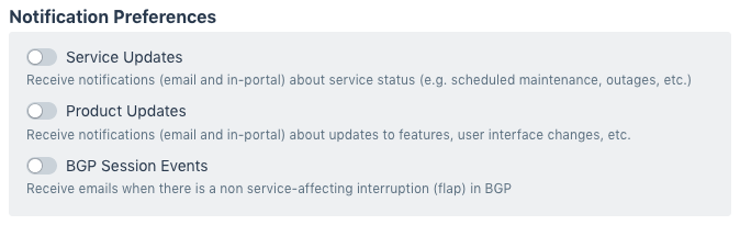 - Service Updates: A switch that enables notifications about service status (e.g. scheduled maintenance, outage, etc.), which are emailed to the user and displayed in the portal during an active session.