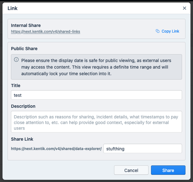 The Share dialog is used to create a public share from a view in one of the modules listed in Sharable Views. The dialog opens from the Share button in the SubNav of the view. Use the settings in the Public Share pane of the Link tab to create the public share (see Public Share Link). Kentik will automatically convert lookback settings (e.g. one day) to a fixed range (e.g. from 24 hours ago to the current time) and creates a public share using that time range.