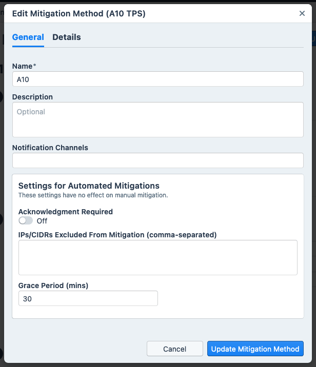 Note: Cloudflare methods have no details to edit. - To save changes, click the Update Mitigation Method button (lower right).