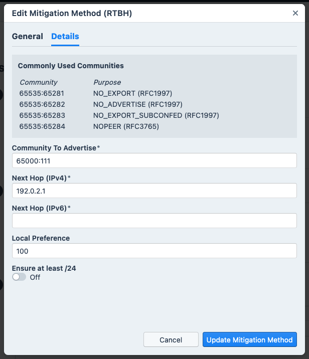 - For information about RTBH method configuration, see RTBH Method Details.