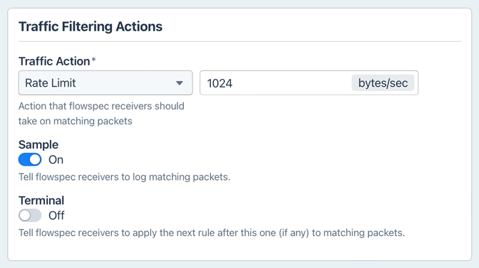 - If the volume of packets is below a router-configured threshold, log every packet matching the Flowspec.
