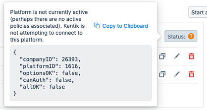 Status summary: Describes the current status, including whether the platform is currently active and whether Kentik is currently trying to connect to it.- Copy to Clipboard: A button that copies the platform properties to the clipboard.