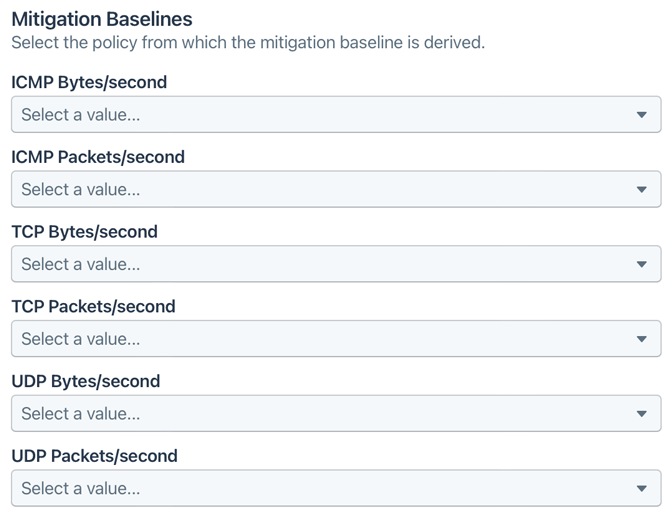 - In the Mitigation Baselines pane, find the dropdown for the protocol (TCP, UDP, or ICMP) and metric (Bytes/second or Packets/second) set on the Dataset tab of the alert policy (see Data Funneling).