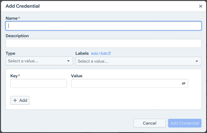 - From the Credentials Vault page, click Add Credential. The Add Credential dialog will open.