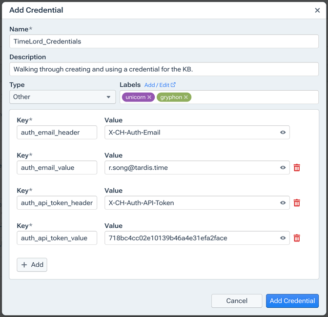 Note: After saving, when your list of key-value pairs is displayed, it will be rearranged to alphabetical order (by key name), so it’s important use a name that is self-explanatory and/or descriptive. - Click Add Credential to save your credential.