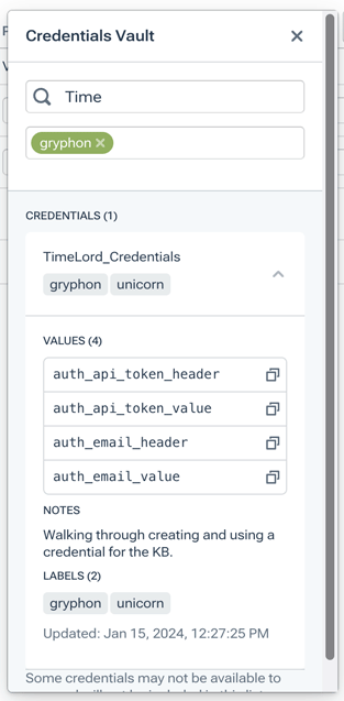 Note: Filtering by credential name is case sensitive. - Click the arrow to the right of a credential’s name to expand it. The credential's key names will be listed under Values.