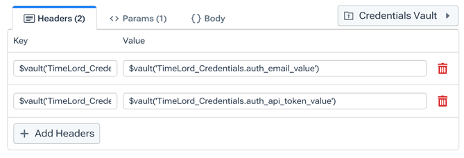 - On the Headers tab in the Configure Request pane, paste the value into the Key field of the first key/value pair. The field will display the following (see Value Variables): $vault('TimeLord_Credentials.auth_email_header')