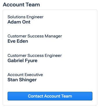 The Account Team pane, located to the right of the Plans pane, contains the names and titles of your Kentik account team. Hover over each individual’s name or click the Contact Account Team button to create a support ticket.