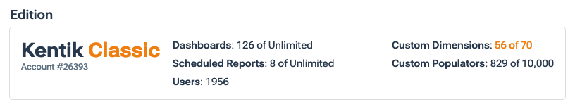 - Custom Dimensions: The number of Custom Dimensions currently used in your organization out of the total number supported by your edition, e.g. "7 of 10."