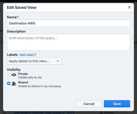 | Visibility | Radio buttons | Required: One of the following, which determines who has access to the view: - Private: view will be available only to you. - Shared: view will be available company wide. |