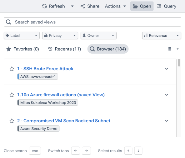 - Select results: Use the up/down arrow keys to select the previous/next saved view in the list.