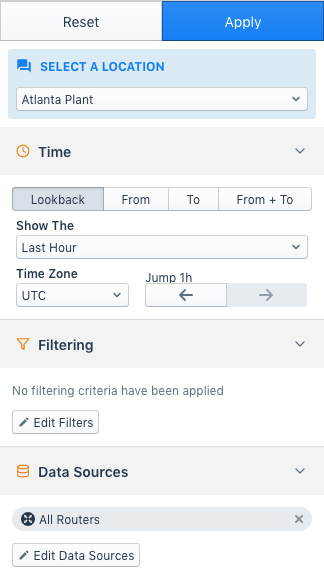 - Apply button: Applies changes made in the Time, Filtering, and Data Sources panes to any sidebar-controlled panels in the display area (see Dashboard Panels):