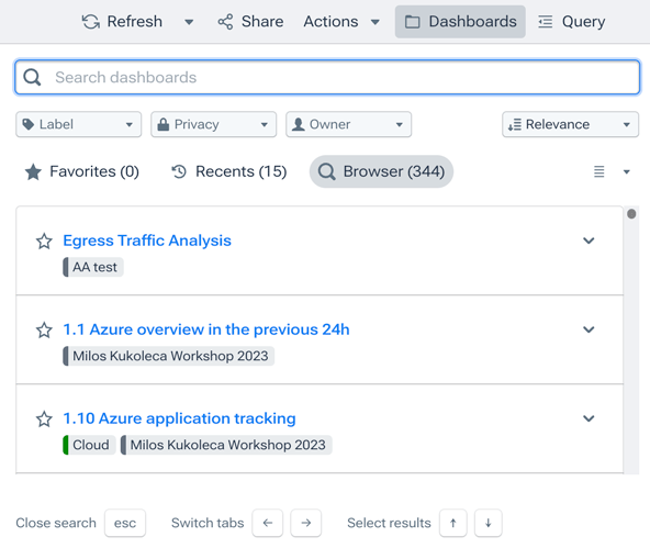 - Select results: Use the up/down arrow keys to select the previous/next dashboard in the list.