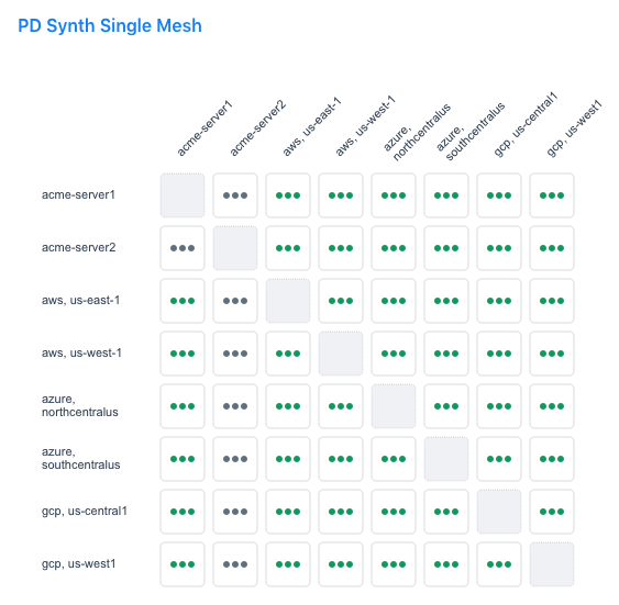 - Single test: A single test defined on the Test Settings page in Synthetics, the display of which will include a health timeline (see Synthetic Test Health) and either a table (see Test Details Table), a density grid (see Density Grid), or a mesh (see Test Mesh Subtab).