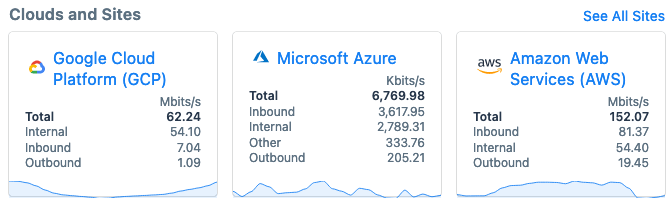 The Clouds and Sites pane is a set of cards providing a high-level look at traffic for each of your organization's clouds and sites. Each card includes the following UI elements: