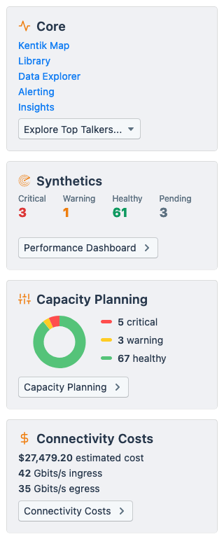 The sidebar on the Network Explorer page is made up of a set of cards that each provide information related to a specific module/workflow in the Kentik portal and/or a link to that module. (This information is independent of the current settings of the parameter controls described in Network Explorer UI.) These sidebar cards include the UI elements listed below: