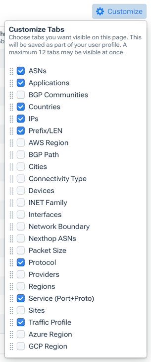 The popup Customize Tabs dialog enables you to configure the display of tabs in the Traffic Table on details pages. The dimensions available for tabs are a subset of the dimensions available for group-by and filtering in Data Explorer. For a given Kentik customer, these dimensions will be the same in all instances of the dialog, but they may vary over time depending on what types of devices you currently have registered with Kentik.