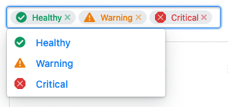 The Capacity Plans list can be filtered to show only plans whose health status (see Capacity Status) matches the statuses selected with this control. By default a lozenge representing each of the three statuses (Healthy, Warning, and Critical) is displayed in the control, meaning that plans of all statuses will be included in the Capacity Plans list.