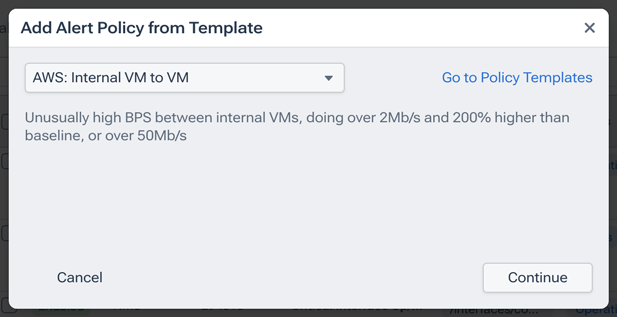 - Continue: A button that takes you to the Add Alert Policy page, whose tabs will be populated with the settings of the template you selected from the drop-down menu. You can tailor the new policy to the specific needs of your organization by adjusting these settings.