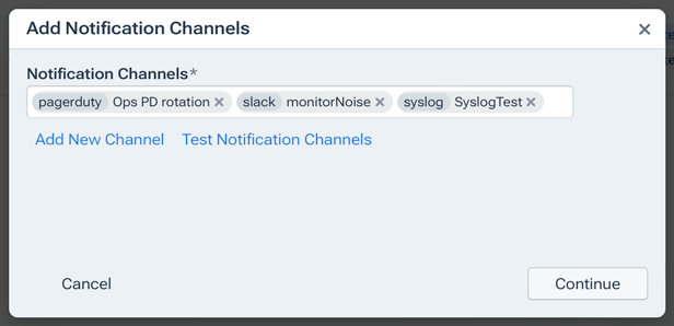 - Add Notification Channels: Opens the Add Notification Channels dialog, where you assign one or more existing or new notification channels to the selected policies.